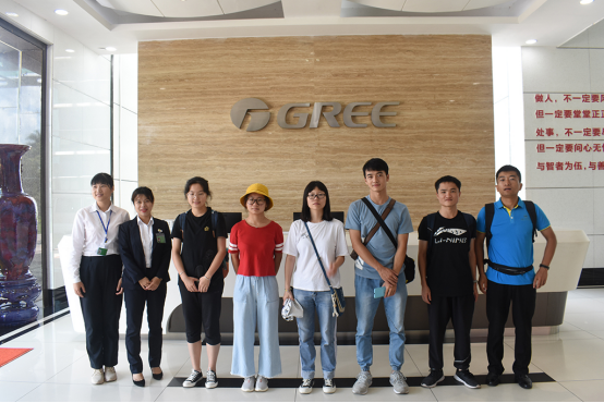 指导老师及小队成员与讲解员在格力电器前合影留念