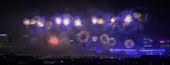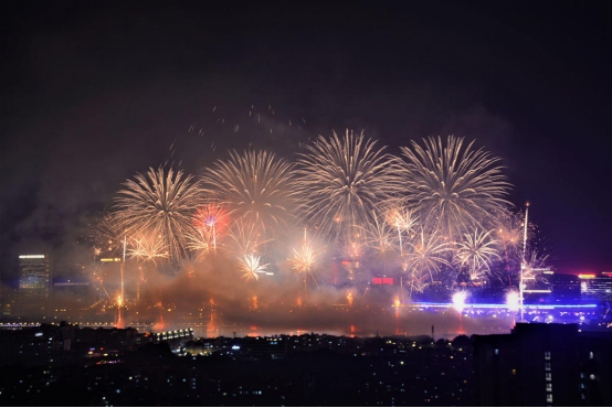 欢度国庆烟火秀:今年国庆十月一号晚上广州琶洲会展中心对出的江面上的庆祝新中国成立七十周年烟火秀表演