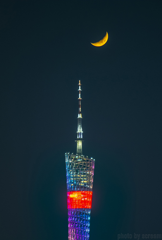 月来粤好:国庆期间的广州塔,与月亮遥相呼应,且塔身闪耀着国旗的光芒