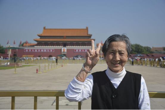 与国同庆:八十六岁的奶奶开心的站在天安门前,为新中国的一切感到骄傲与自豪