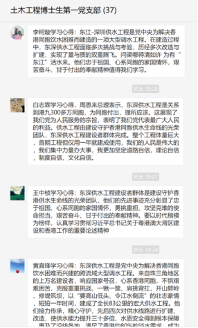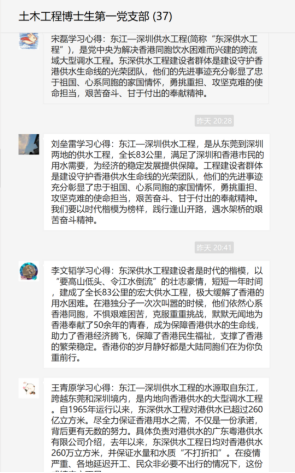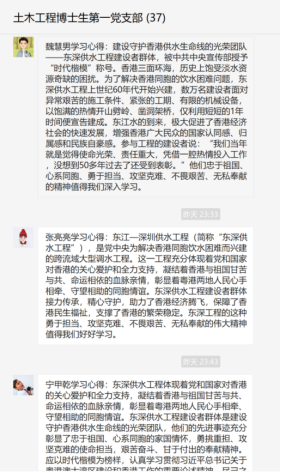 【哈工大(深圳)宣】(土木工程博士生第一党支部/图、文)2021年4月23日,土木工程博士生第一党支部全体党员在党支部的带领下收看“时代楷模”东深供水工程建设者群体发布仪式电视节目《时代楷模发布厅》,结束后各位党员同志在支部群内展开了热烈讨论并发表了学习心得。本次学习在线上进行,支部37位党员、预备党员、积极分子全部参与学习,有27位同志和大家分享了自己的学习心得。部分党员同志学习心得摘录如下。