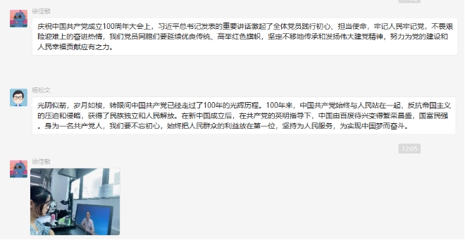 环境博士生第一党支部书记曾豪杰说:一百年来,为实现中华民族的伟大复兴,中国共产党团结带领中国人民进行新民主主义革命,进行了社会主义革命和建设,创造了改革开放和社会主义现代化建设,创造了新时代中国特色社会主义。2021年07月01日,中国共产党向全世界庄严宣告了在中华大地上全面建成了小康社会,历史性地解决了绝对贫困问题,正在意气风发向着全面建成社会主义现代化强国的第二个百年奋斗目标迈进。纵观百年的中国历史进程,没有中国共产党就没有中国如今的发展。作为中国人民,为中国的发展感到骄傲自豪,为中国共产党今后的创造更有信心。作为党员,作为青年,我们定当立鸿鹄志,不负韶华,不负人民,新百年,永远跟党走,为建设更好的中国奋斗在终身!