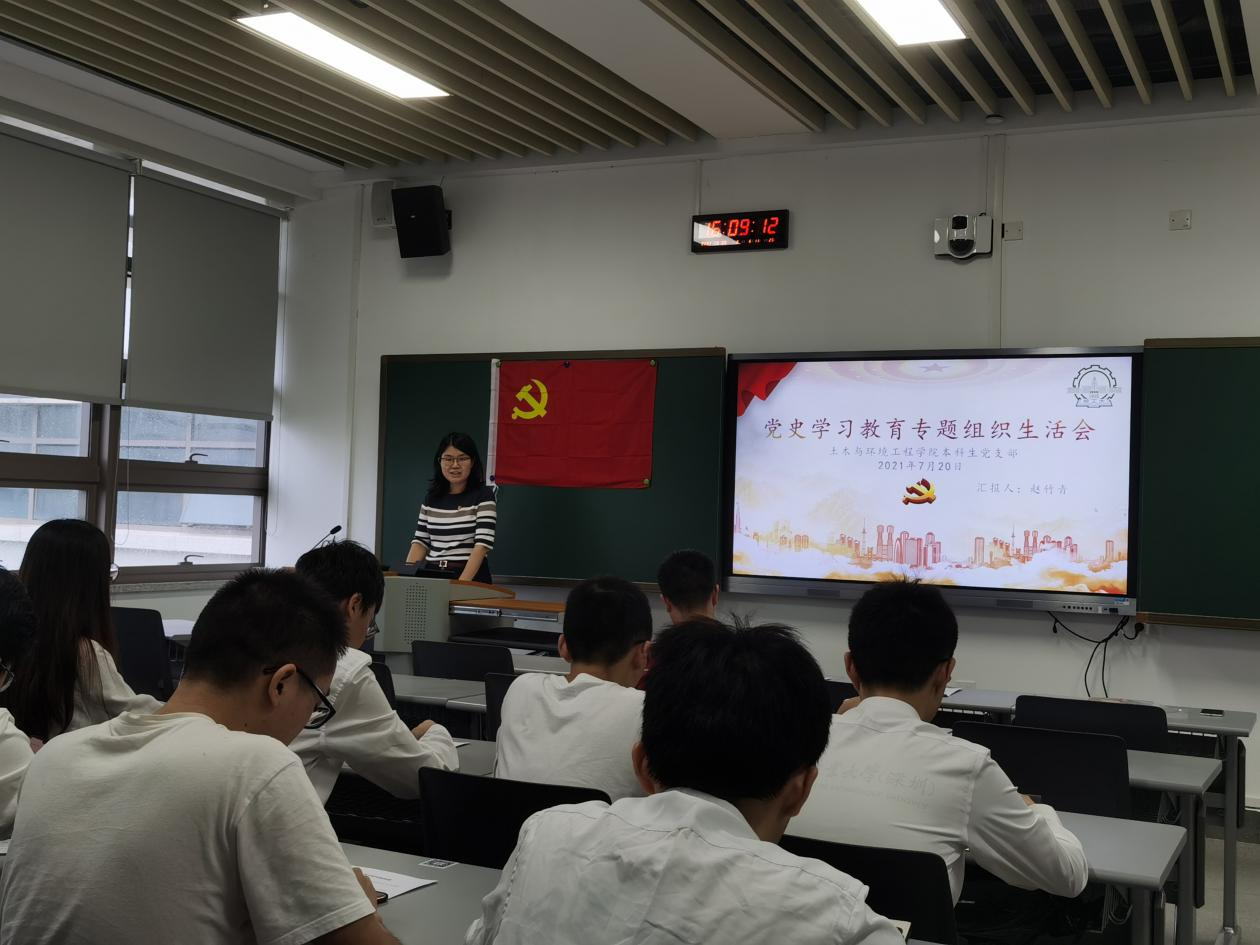 【哈工大(深圳)土木与环境工程学院 宣】2021年7月20日16:00,土木与环境工程学院本科生党支部在T3605开展七月份党员大会暨党史学习教育专题组织生活会。本次大会由本科生党支部副书记张书衡主持,支部全体成员和学院党委书记肖仪清、本科生党支部书记赵竹青参会。