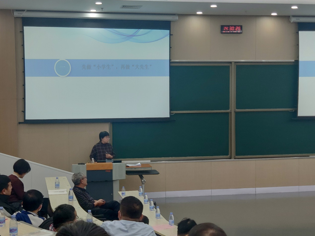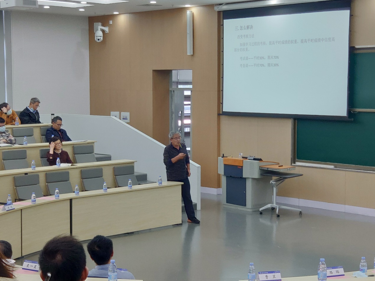 张金生教授根据自己多年的教学经验,为全院教职工分享了如何“从提高学习成绩信度入手保证教学质量”。他依据提出教学中问题-探寻原因-提出解决办法的思路,剖析了课堂中常见的学生旷课和不认真听课等问题的原因。张教授指出,成绩评定方式不合理,从而使得成绩信度过低是使学生丧失对课程热情与积极性的重要原因。针对这一问题,他表示,加强学习过程考核以及提高平时成绩权重是行之有效的方法。为此,他结合自身教学经验分享了“5分钟测验法”、讲授和课堂讨论相结合等教学方法以提高学习成绩信度。