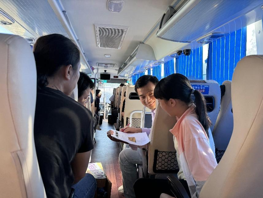 在前往天文台的路上,袁丁老师为大家介绍了深圳市天文台的情况以及当天的行程安排,还为小朋友们准备了知识竞赛问答题,学院工会也准备了精美的礼品。大巴车上小朋友和家长们都开始积极地讨论题目的内容。在到达天文台之前,袁老师批改完题目,向大家公布了获奖名单。三名小朋友获得了一等奖,其他小朋友也纷纷挑选到了喜爱的天文图书作为优胜奖奖品。