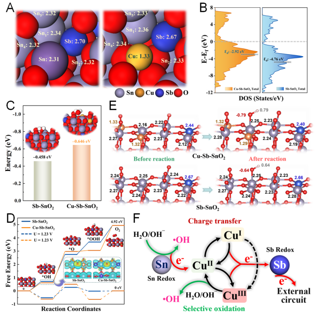 图2:DFT计算结果。DFT计算结果表明Cu掺杂有效优化了锡锑电极的电子结构,低反应能垒、强水分子吸附能和电荷转移能力有效促进了•OH生成。首次提出了Cu氧化还原穿梭作为“电子搬运工”增强了Sb和Sn之间的电子转移