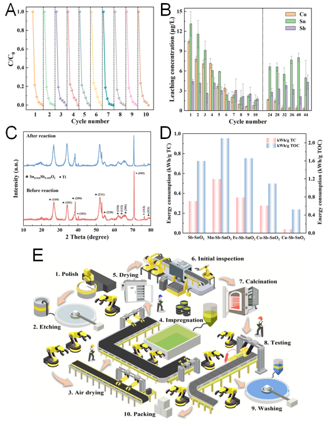 图3:Cu-Sb-SnO2阳极的实际应用潜力。实验结果证实了Cu-Sb-SnO2电极优异的稳定性、适应性以及低能耗、低成本。这种制备方法易于大规模生产,从电极预处理到成品包装的整个制备过程有望实现完全的机械化和自动化控制。