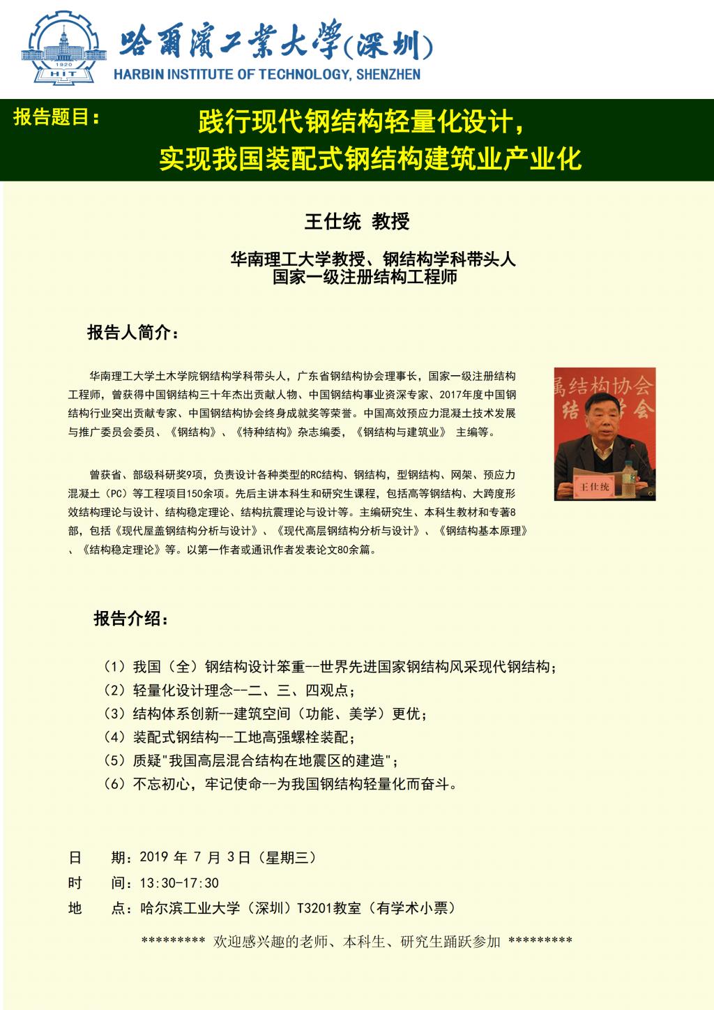 华南理工大学王仕统教授讲座“践行现代钢结构轻量化设计,实现我国装配式钢结构建筑业产业化”(7.3)