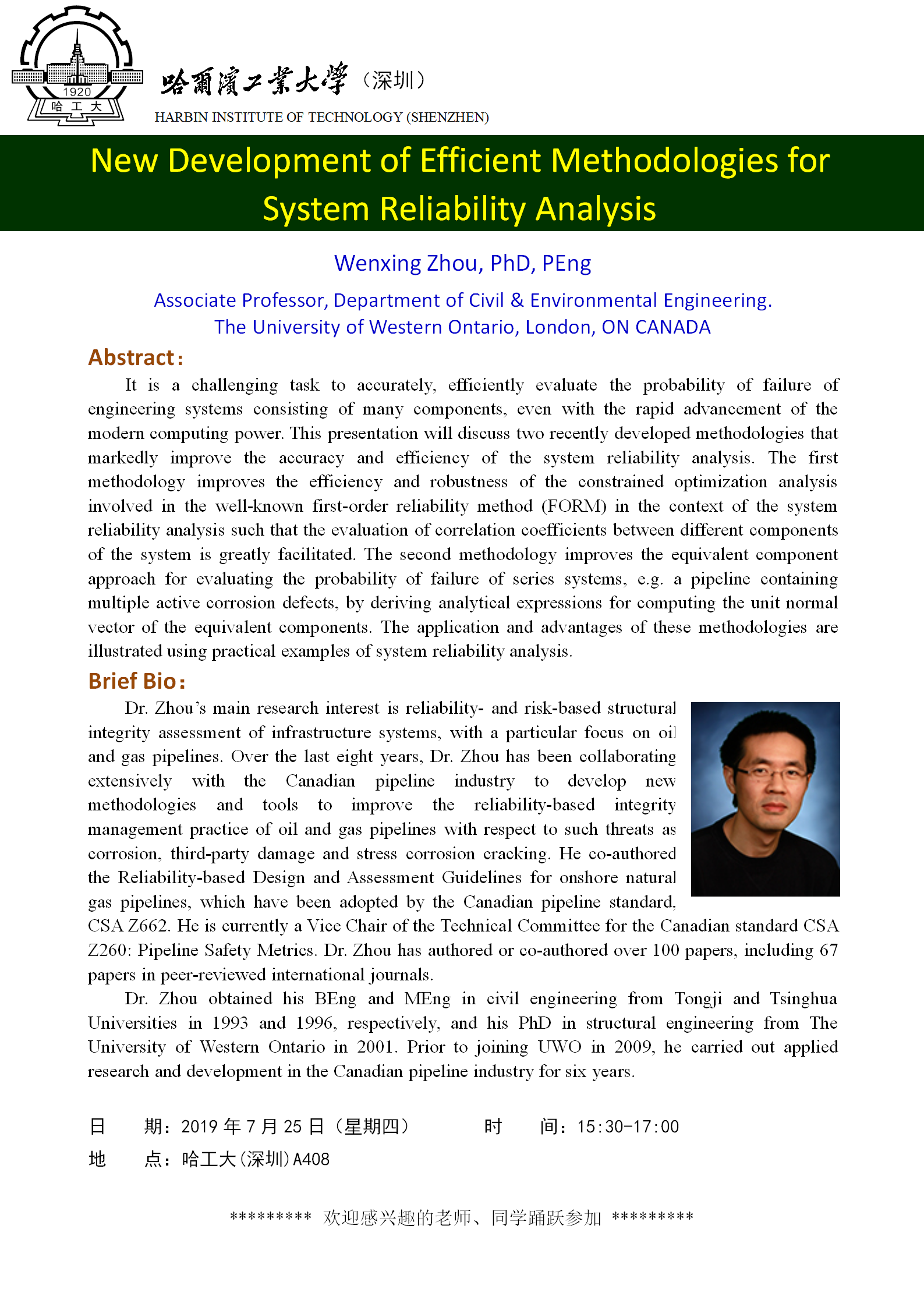 Wenxing Zhou副教授讲座“New Development of Efficient Methodologies for System Reliability Analysis”(7.25)