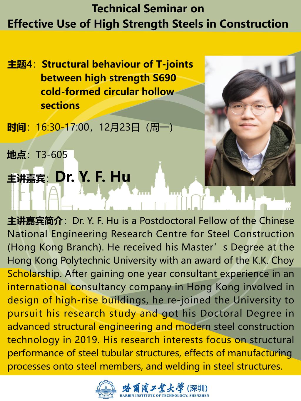 香港理工大学博士后胡亦非讲座:“Structural behaviour of T-joints between high strength S690 cold-formed circular hollow sections”(12.23)