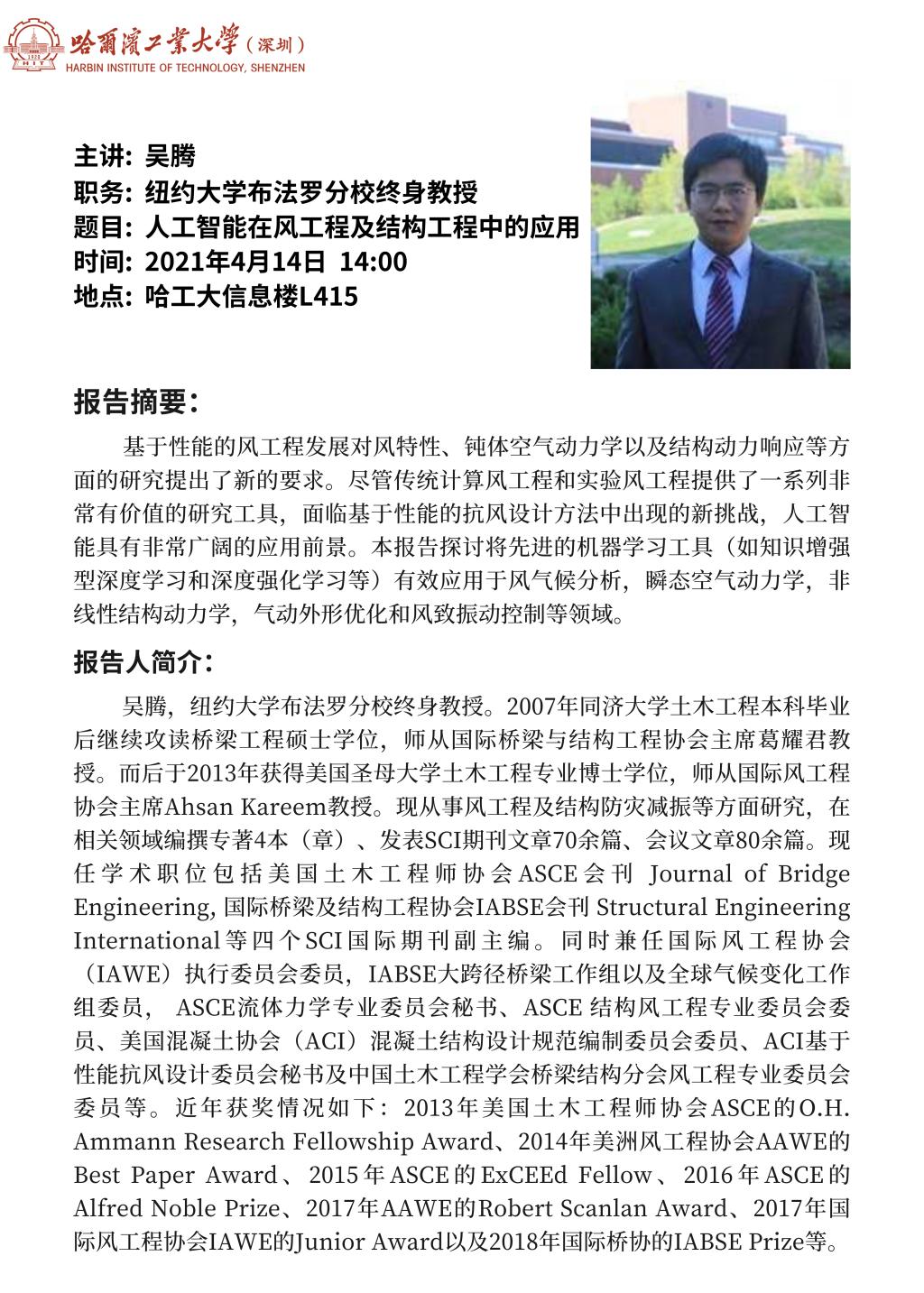 吴腾,纽约大学布法罗分校终身教授。2007年同济大学土木工程本科毕业后继续攻读桥梁工程硕士学位,师从国际桥梁与结构工程协会主席葛耀君教授。而后于2013年获得美国圣母大学土木工程专业博士学位,师从国际风工程协会主席Ahsan Kareem教授。现从事风工程及结构防灾减振等方面研究,在相关领域编撰专著4本(章)、发表SCI期刊文章70余篇、会议文章80余篇。现任学术职位包括美国土木工程师协会ASCE会刊 Journal of Bridge Engineering, 国际桥梁及结构工程协会IABSE会刊 Structural Engineering International等四个SCI国际期刊副主编。同时兼任国际风工程协会(IAWE)执行委员会委员,IABSE大跨径桥梁工作组以及全球气候变化工作组委员, ASCE流体力学专业委员会秘书、ASCE 结构风工程专业委员会委员、美国混凝土协会(ACI)混凝土结构设计规范编制委员会委员、ACI基于性能抗风设计委员会秘书及中国土木工程学会桥梁结构分会风工程专业委员会委员等。近年获奖情况如下:2013年美国土木工程师协会ASCE的O.H. Ammann Research Fellowship Award、2014年美洲风工程协会AAWE的Best Paper Award、2015年ASCE的ExCEEd Fellow、2016年ASCE的Alfred Noble Prize、2017年AAWE的Robert Scanlan Award、2017年国际风工程协会IAWE的Junior Award以及2018年国际桥协的IABSE Prize等。