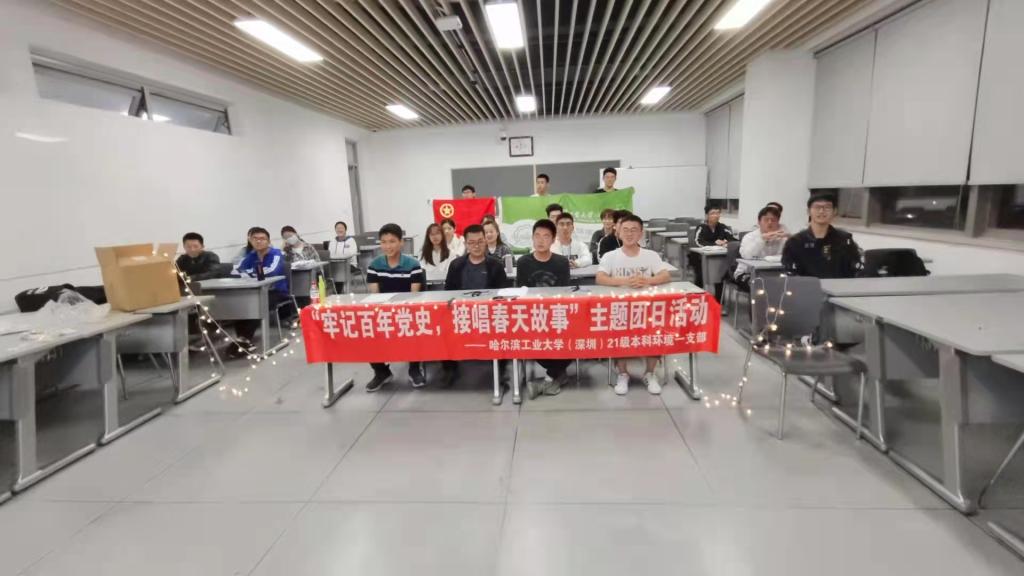 【哈工大(深圳)土木与环境工程学院宣,冉欣雨/文、冉欣雨/图】为了迎接共产党的百年华诞,展现支部团员以及群众的活力,2021年10月22日,土木环境与工程学院21级本科环境第一团支部顺利开展"活力在基层"主题团日活动。本支部紧紧围绕“青春向党·奋斗强国”的命题,以“牢记百年党史,接唱春天故事”为主题,组织全体团员带动全班同学们积极参与其中,共同学习百年党史,歌唱祖国大好风华。