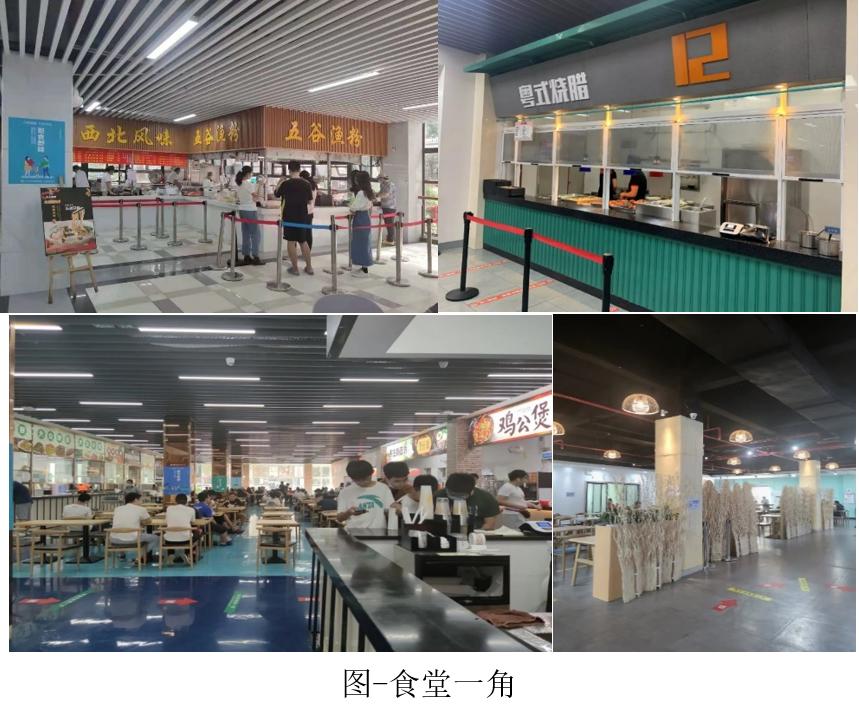 学校有4个大食堂、大学城有10+个食堂,可以满足每位同学的需求(见图-食堂一角)。
