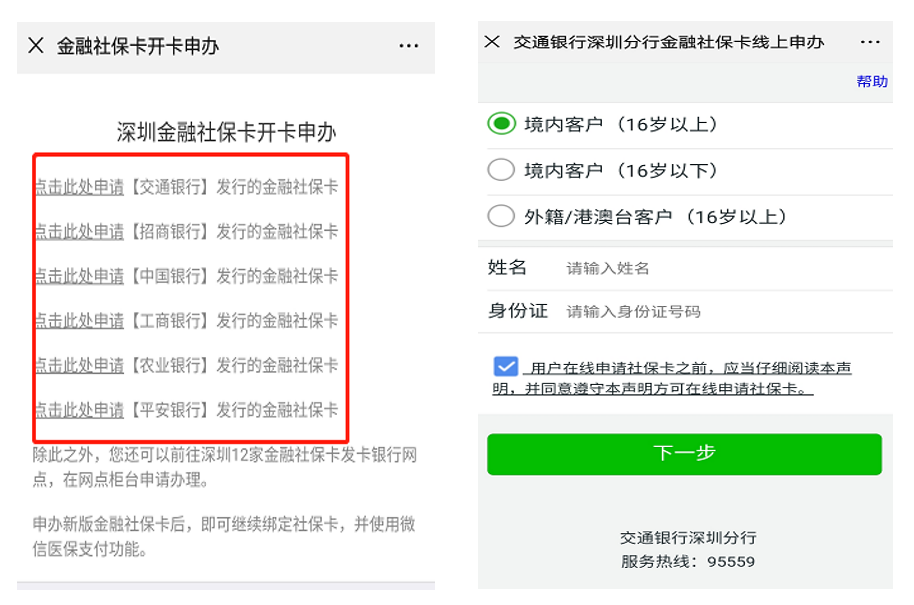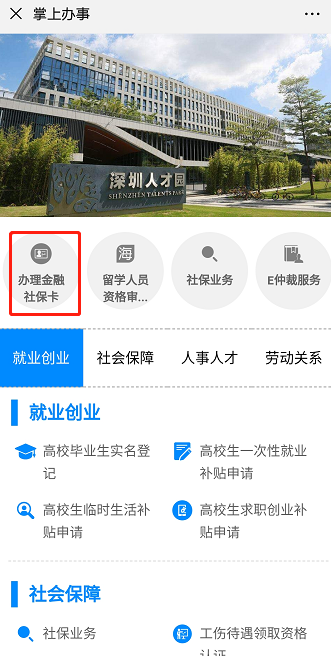 第一步:微信搜索“深圳之窗”公众号,回复关键词“社保卡”,找到深圳金融社保卡办理入口,进入如下页面,点击“办理金融社保卡”。